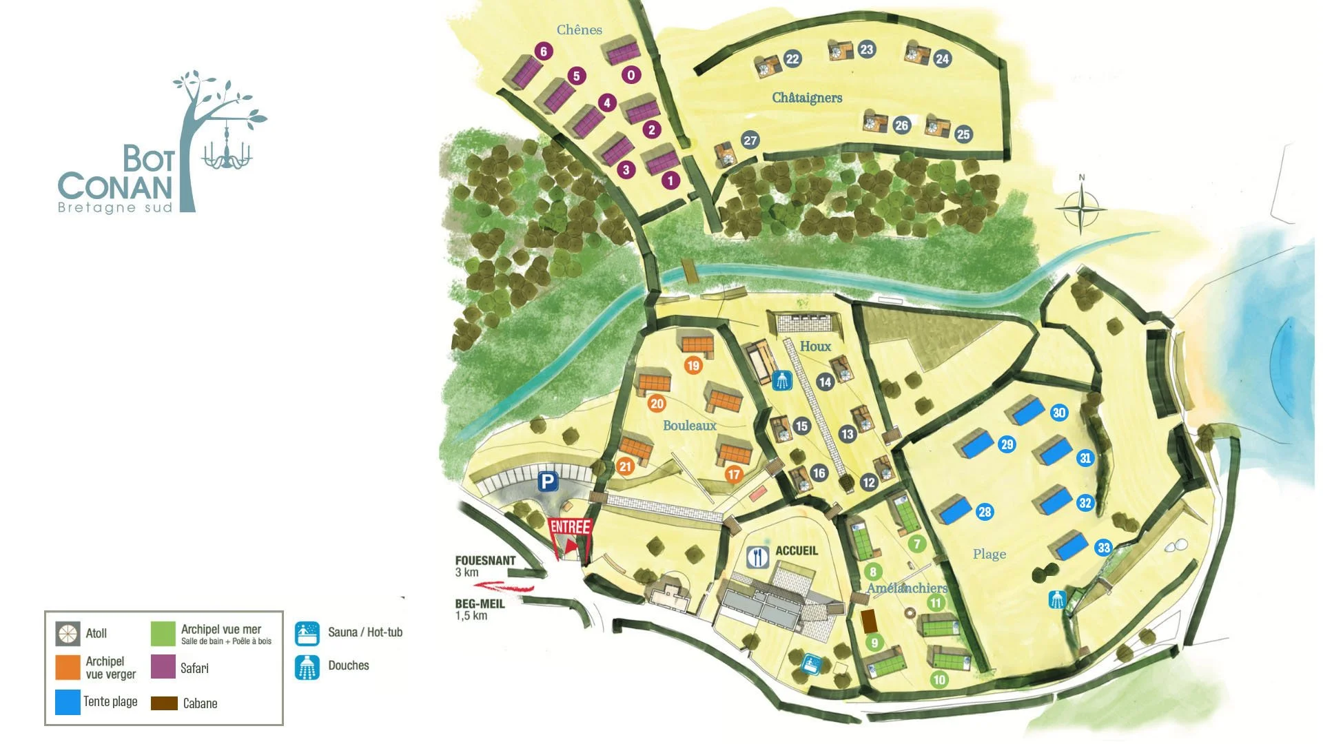 Situées dans le champ des Houx et des Châtaigniers, nos tentes Atoll allient plaisir du camping et confort : toutes équipées d’une cuisine/salle à manger couverte et d’un sundeck.
